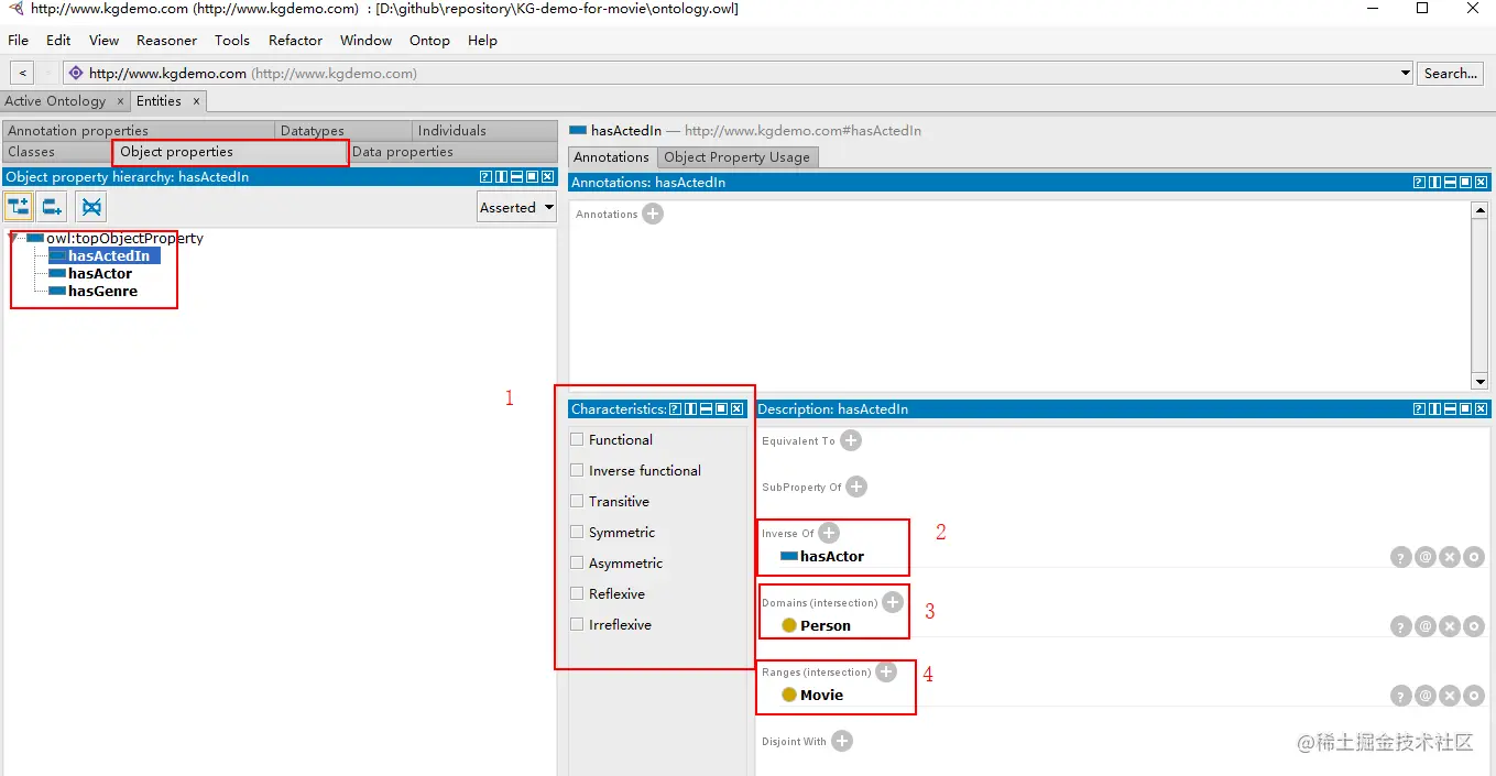 接下来我们切换到 "Object Properties" 页面,我们在此界面创建类之间的关系,即,对象属性。这里我们创建了三个对象属性,"hasActedIn" 表示某人参演了某电影,因此我们在右下方的 3 号矩形框中定义该属性的 "domain" 是人,4 号框定义 "range" 是电影。这个很好理解,"domain" 表示该属性是属于哪个类的,"range" 表示该属性的取值范围。2 号框表示该属性的逆属性是 "hasActor",即,有了推理机,尽管我们的 RDF 数据只保存了 A 出演了 B,我们在查询的时候也能得到 B 的演员有 A。1 号方框中是一些描述该属性的词汇,我们在上一篇文章中已经介绍过,这里不再赘述。同理,我们定义另外两个属性,这里不再展示。