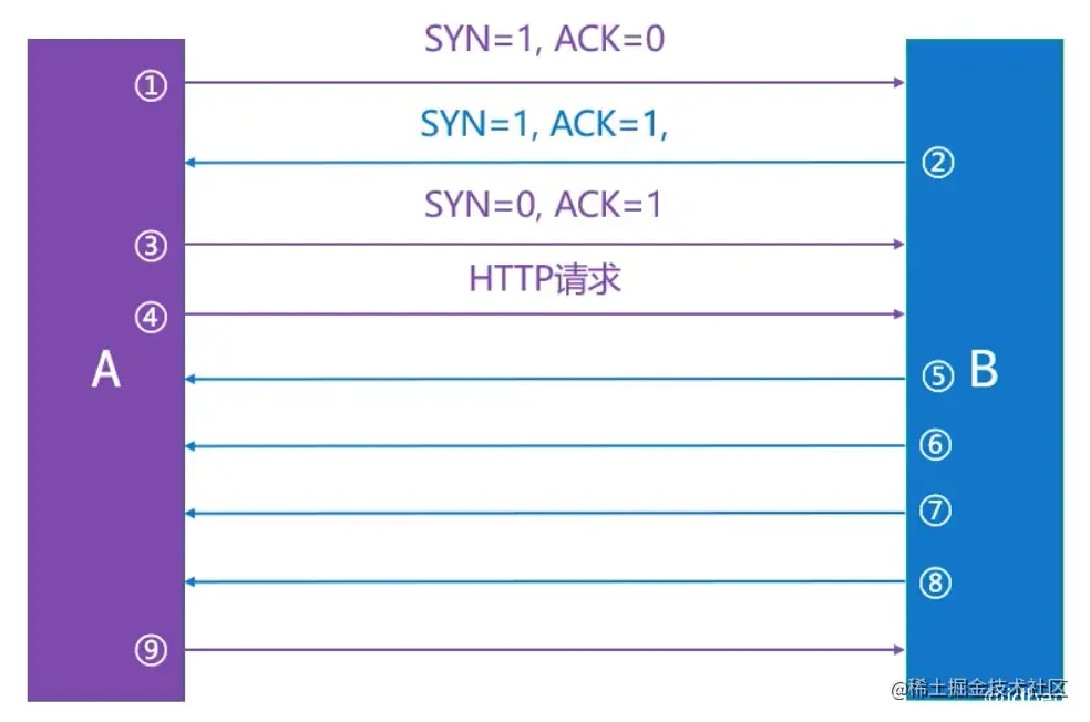 建立连接时只有前两次的SYN是1(SYN=1),后面的SYN都是0(SYN=0)。连接建立后(三次握手)开始正式发送HTTP请求。