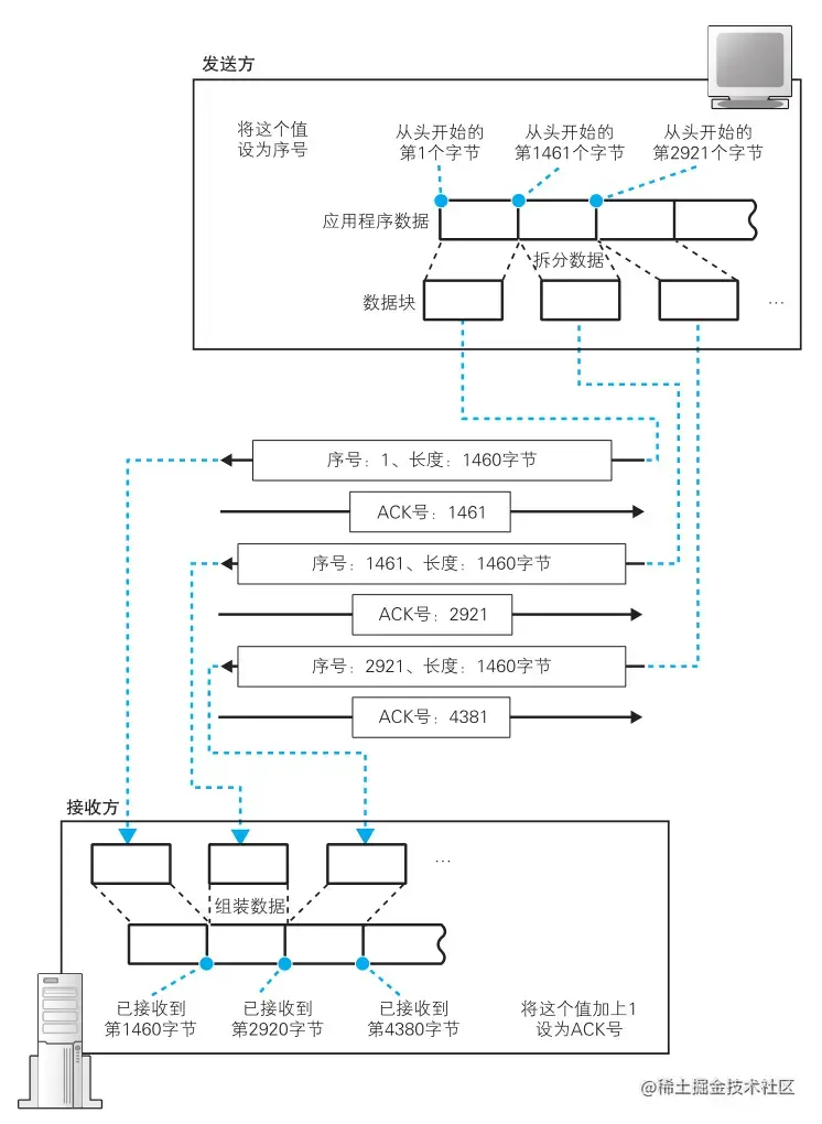 比如客户端的序号初始值是123456,服务器的序号初始值是56789。连接建立后,客户端发送的第一个包的序号就是Seq = 123456 + 1 = 123457,假设TCP包长度Length是100个字节,服务端的ACK号就是:ACK = Seq + Length = 123557。