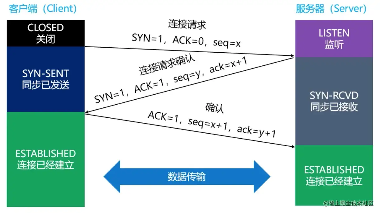 CLOSED:client处于关闭状态。LISTEN:server处于监听状态,等待client连接。SYN-RCVD:表示server接收到了SYN报文,当收到client的ACK报文后,它会进入到ESTABLISHED状态。SYN-SEND:表示client已发送SYN报文,等待server的第2次握手。ESTABLISHED:表示连接已经建立。