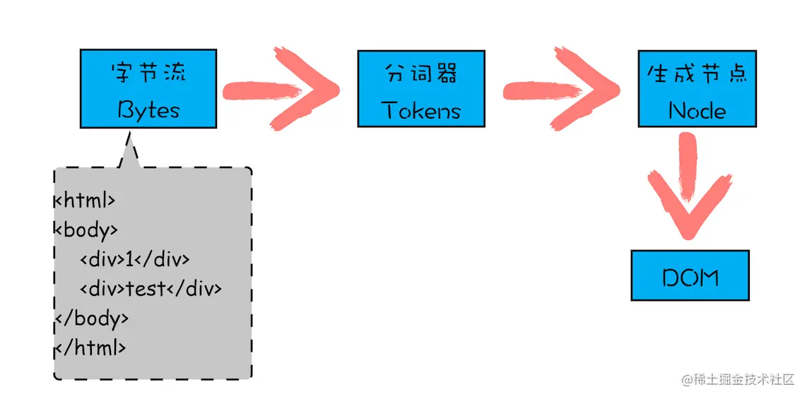在渲染引擎内部,通过HTML解析器(HTMLParser)将 HTML 字节流转换为 DOM。