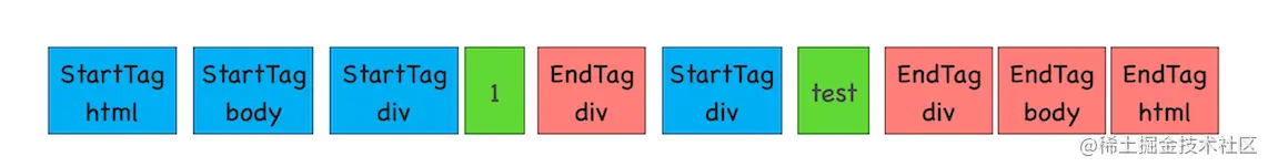 词法分析,通过分词器将字节流转换为 Token,分为 Tag Token 和 文本 Token。上图中代码生成的 Token 如下: