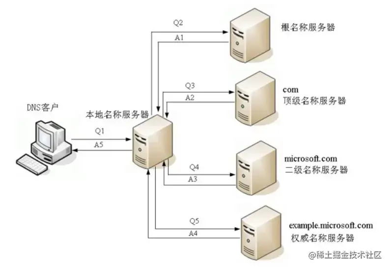 设备访问一个域名的时候会优先从本地名称服务器查找对应的IP,如果没有找到就会请求根服务器,一级一级往下找,直到找到对应的域名为止,最后将域名对应的IP返回到设备并在本地服务器做一个缓存。