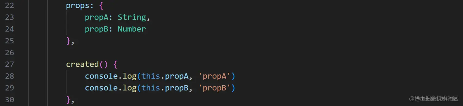如图所示,可以用一维数组的形式申明多个prop属性。但需要注意的是声明后需要通过