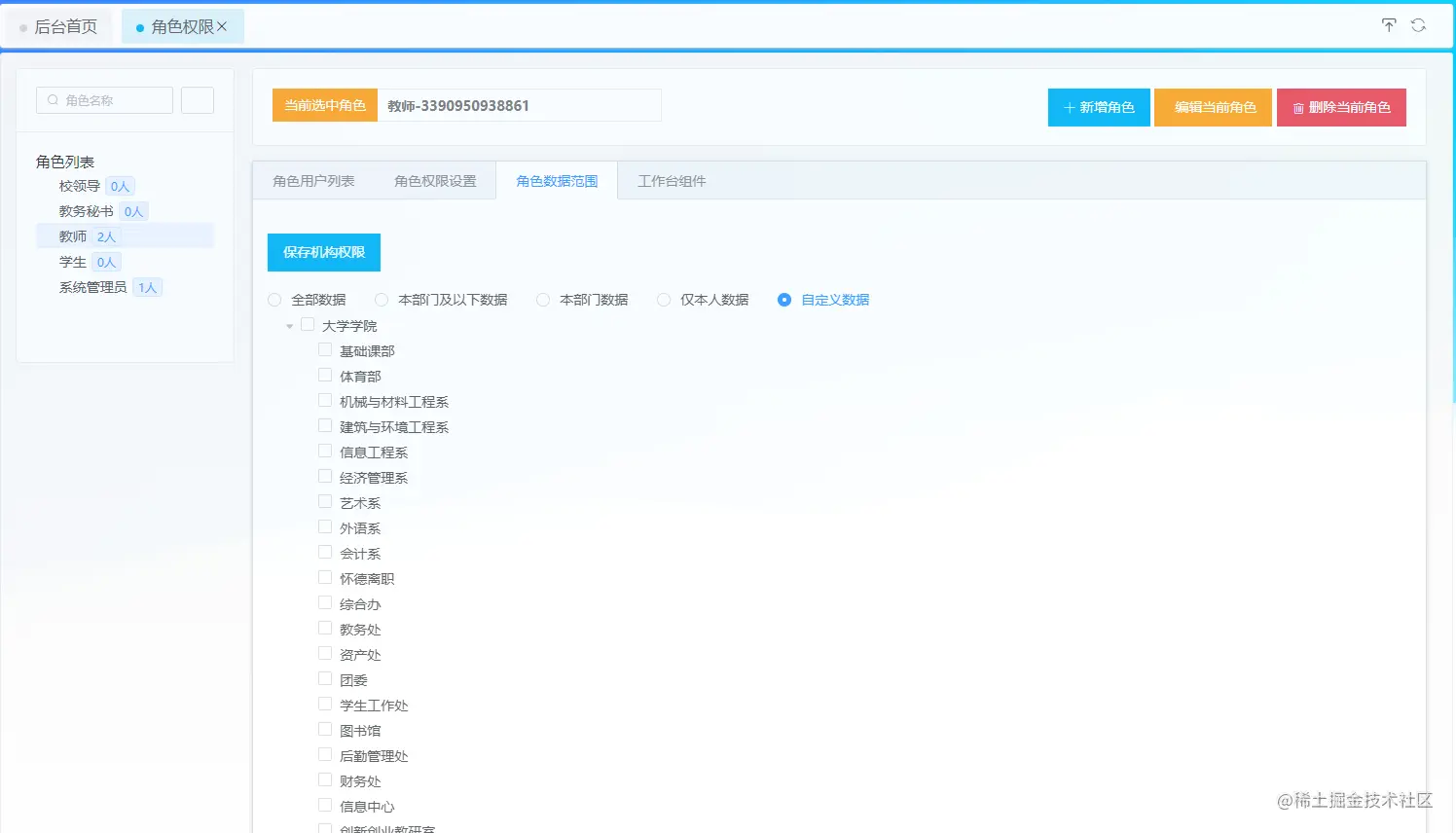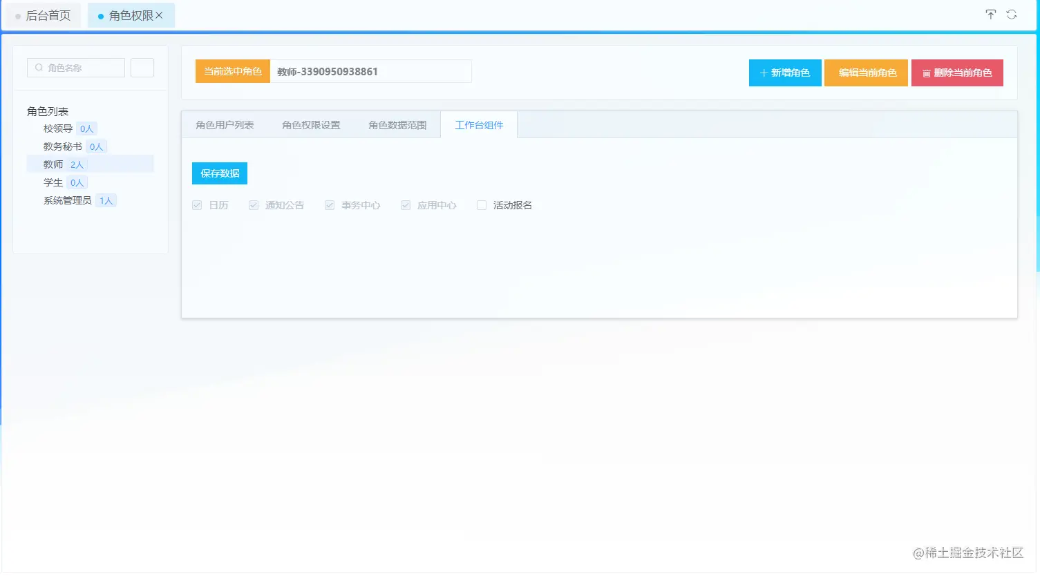 工作台组件权限: 为当前选中角色分配工作台组件,用户在工作台中能看见哪些组件就是在这里决定的