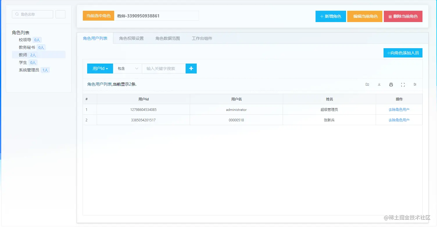 角色用户管理:主要用于查看当前选中角色下的人员信息,可以进行增加和删除操作