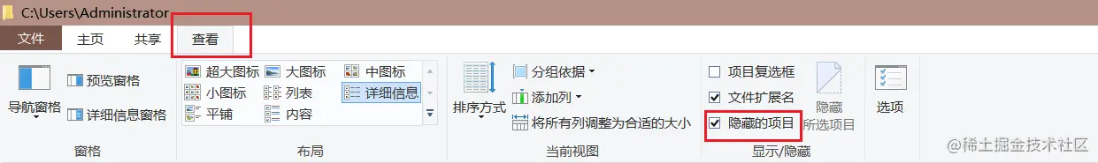 只需在文件资源管理器中点击【查看】,勾选【隐藏的项目】即可