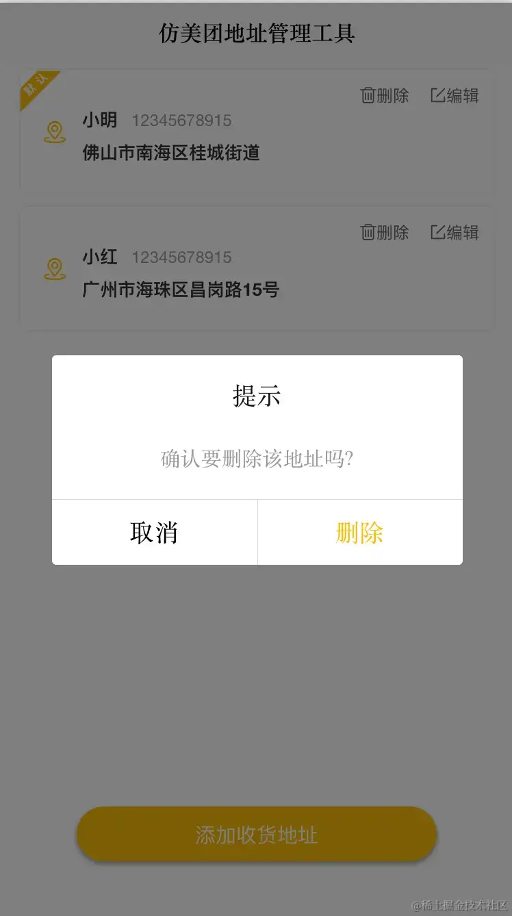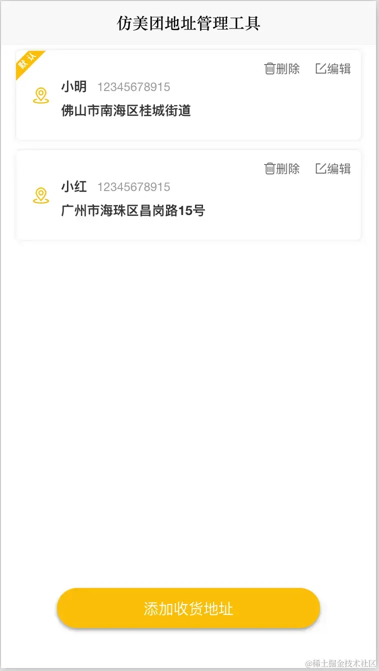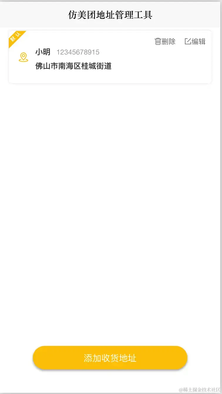 今天给大家介绍的一款组件仿美团地址管理组件列表组件 可用于电商平台收获地址管理;