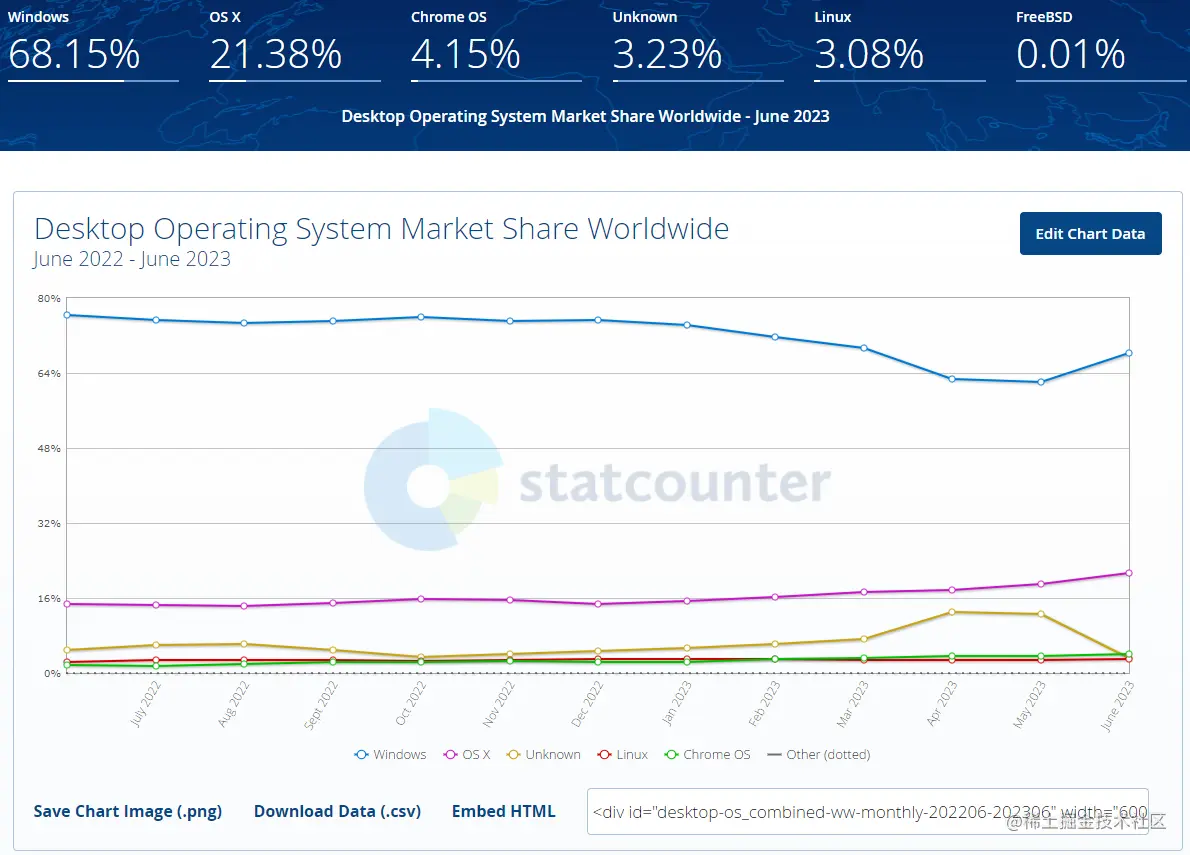 流量监测机构 StatCounter 的最新数据表明,截至 2023 年 6 月,Linux 已经取得了 3% 的桌面市场份额。其他操作系统占比分别为 Windows( 68.15%)、OS X(21.38%)以及 Chrome OS(4.15%)。