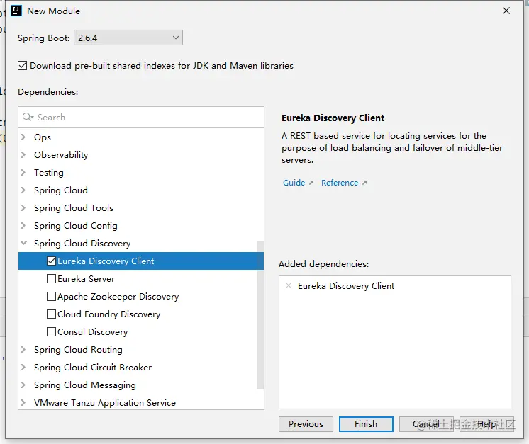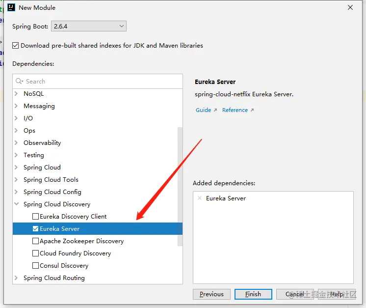 2.3 选择SpringCloud 组件配置,选择左侧Spring Cloud Discovery,然后选择Eureka Server,同时也可以选择工程基于的SpringBoot版本,这里我使用默认的(2.6.4),然后点击Finish。