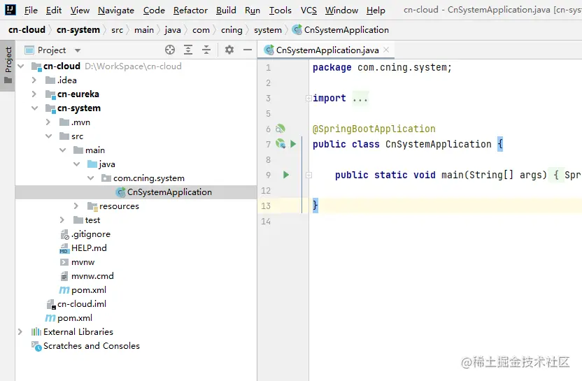 3.6 修改CnSystemApplication.java,在注解SpringBootApplication后加上(scanBasePackages = {"com.cning"})