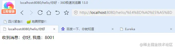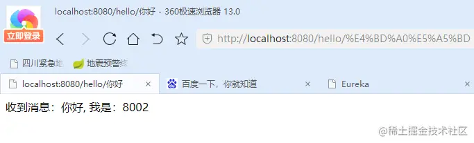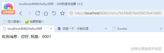 4.6 浏览器中访问localhost:8080/hello/你好**,可以看到输出结果,再次刷新访问,可以发现每次调用不同端口。**