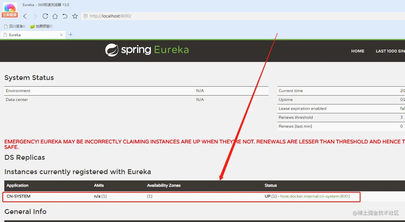 **3.7 运行CnSystemApplication.java,启动成功后从Eureka管理台(localhost:8000)可以看到cn-system已经注册