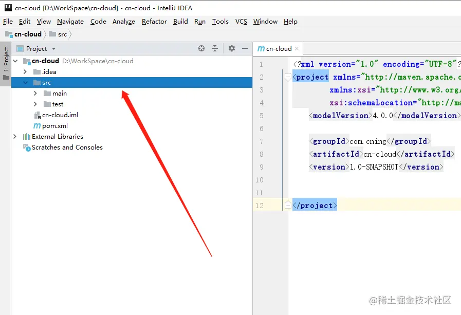 1.4 工程结构如图,因为后面会创建子工程(springcloud实际代码模块),所以src文件夹可以删掉了