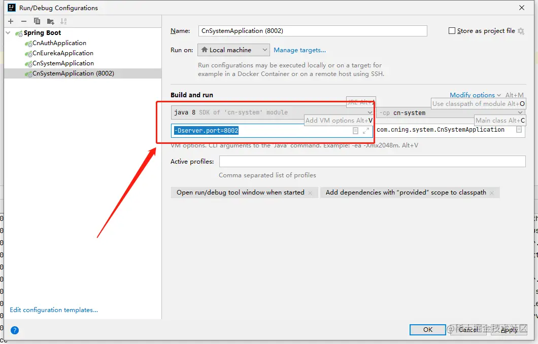 ****** 为了验证feign的负载均衡,我们在idea的Run/Debug配置中复制一个CnSystemApplication,如下图,在VM options中添加 -Dserver.port=8002,设置端口为8002