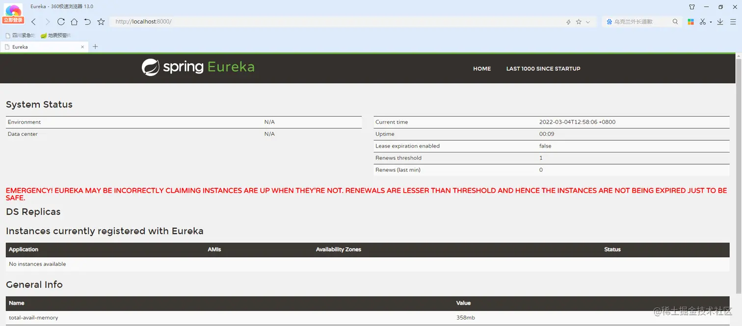 2.8 浏览器中输入localhost:8000,可以看到打开了Eureka控制台界面