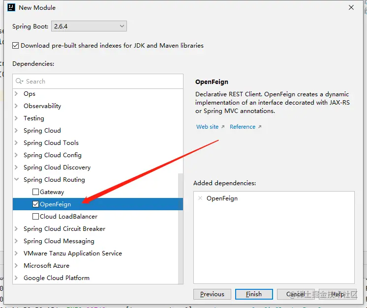 创建和前面一样,就不上图了,注意选择依赖的这一步,选择Spring Cloud Routing中的OpenFeign,然后继续