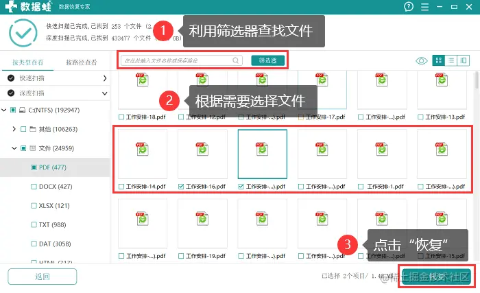 3.选择需要恢复的文件:等待扫描结束,在界面中会呈现扫描到的结果。我们可以根据个人的实际需求,并利用软件的【筛选器】等功能,将所有需要恢复的文件选择齐全;