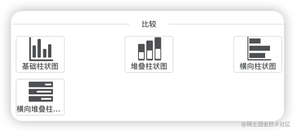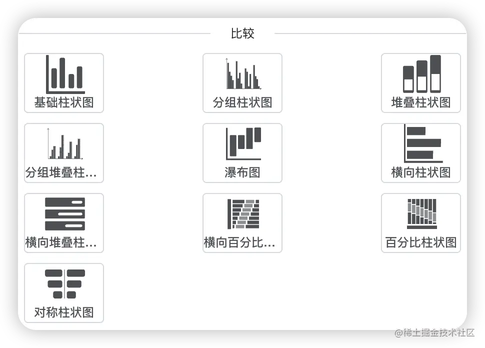 • 视图类型:AntV相比ECharts多了瀑布图(主要用于展示股票趋势变动)、百分比图(着重展示比例信息、例如高校男女占比等,主要用于国家统计、用户调查等)、对称柱状图(主要用于两个类别不同指标间的比较,例如某班级男女生各科成绩比较等);