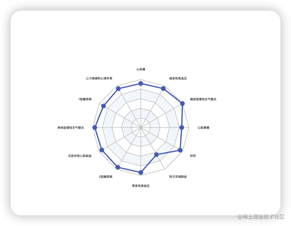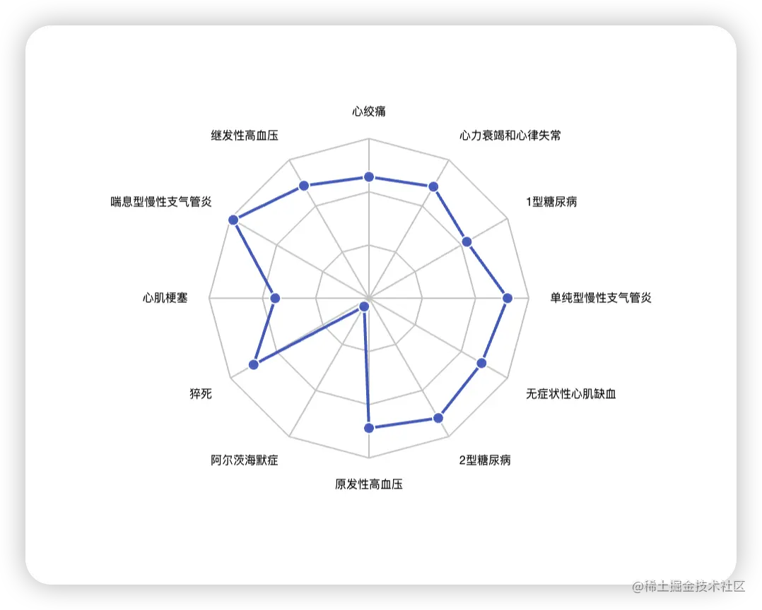 ECharts和AntV的雷达图都不可以调整轴值(每格数据的大小)。假设各指标的数据为:90,100,95,110。ECharts的轴值是绝对值,雷达中心点=0,雷达边缘点=数据指标列最大值。使用ECharts难以看出细微差别。此时比较适合使用AntV图。AntV的轴值为相对值,雷达中心点=数据指标列最小值,雷达边缘点=数据指标最大值。
