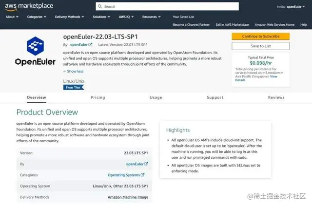 openEuler 22.03 LTS镜像正式登录AWS Marketplace,目前在亚太及欧洲15个Region开放使用,后续将开放更多版本和区域,openEuler 22.03 LTS AMI(Amazon Machine Images)由openEuler社区提供支持。