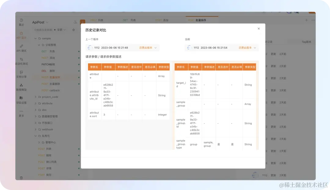 收到通知后,通过版本管理工具可以在 API 预览页面查看 API 的版本信息、修改记录。可以与历史版本做对比,同时还能一键回滚到历史版本。此外,你还可以通过标记 Tag 来记录 API 版本,方便版本管理和变更追踪。