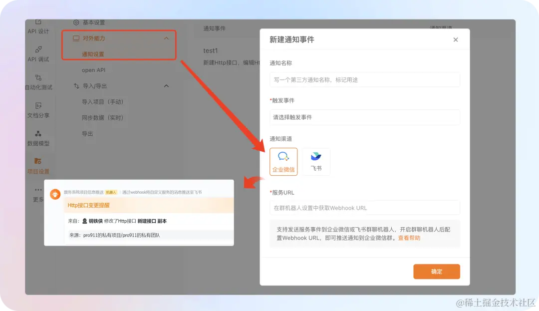 在「项目设置」-「对外能力」-「通知设置」中创建通知事件,选择触发事件、通知渠道和 Webhook URL,就可以 API 变更通知了,目前仅支持企业微信和飞书,后续会支持钉钉等多个协作工具。