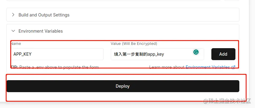 填入环境变量 APP_KEY,点击"Add",然后点击"Deploy"。