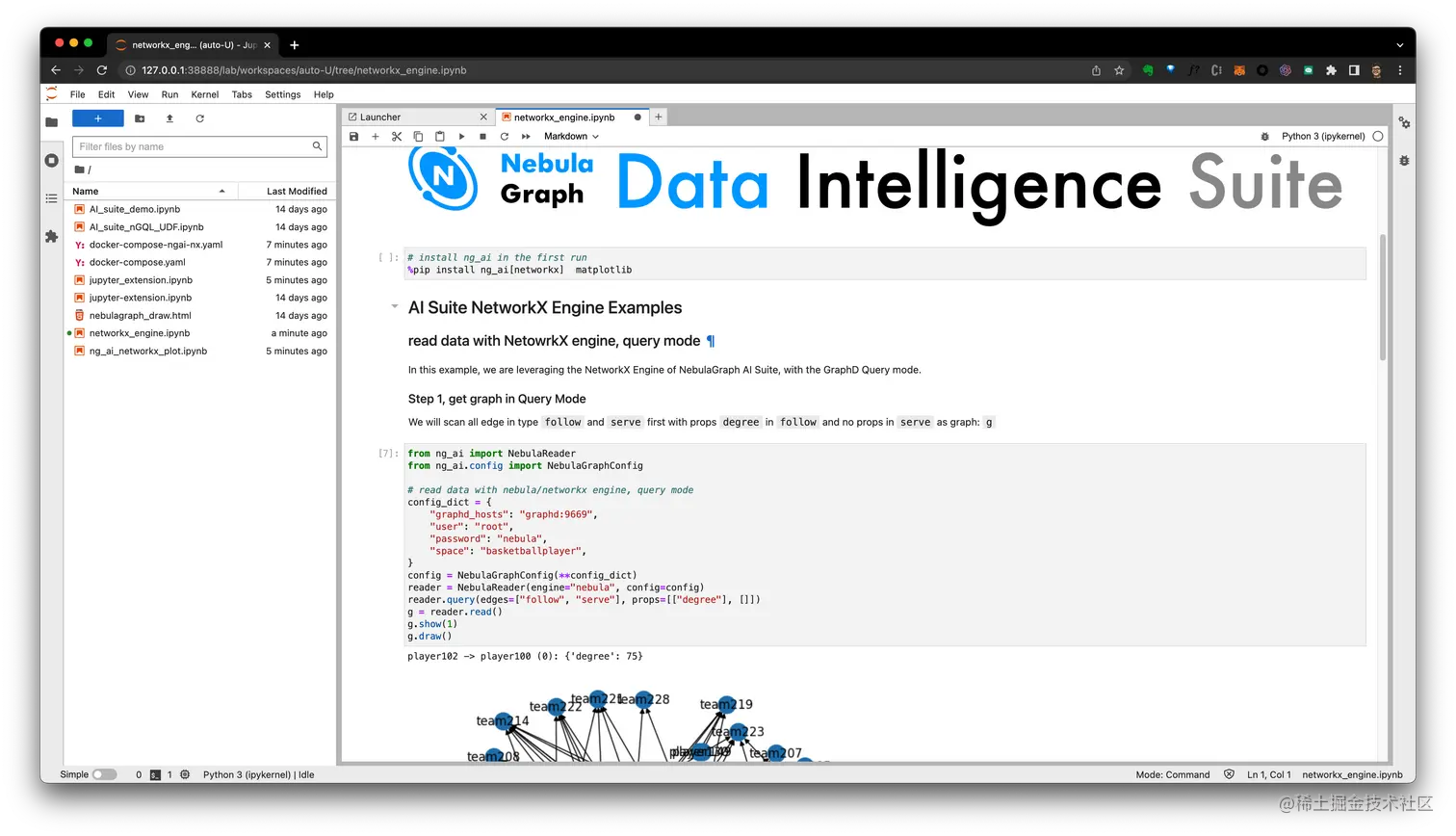 ng_ai 的全名是:Nebulagraph AI Suite,顾名思义,它是在 NebulaGraph 之上跑算法的 Python 套件,希望能给 NebulaGraph 的用户一个自然、简洁的高级 API。简单来说,用很少的代码量就可以执行图上的算法相关的任务。
