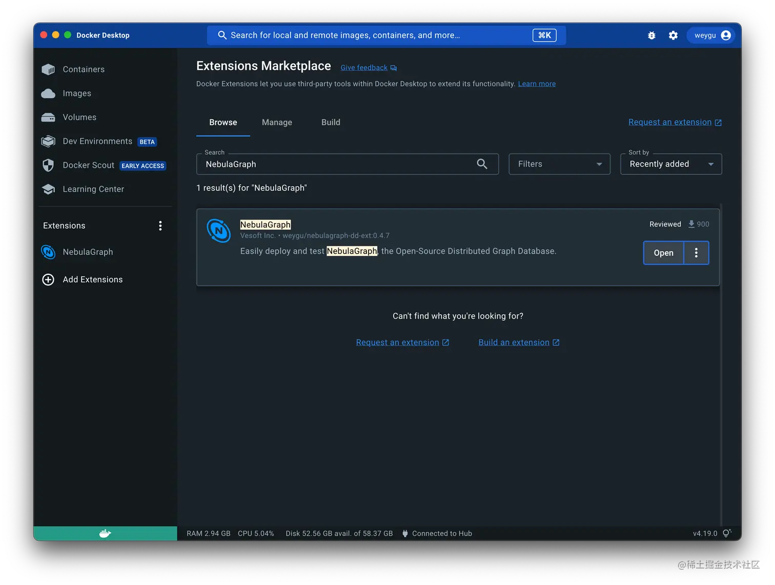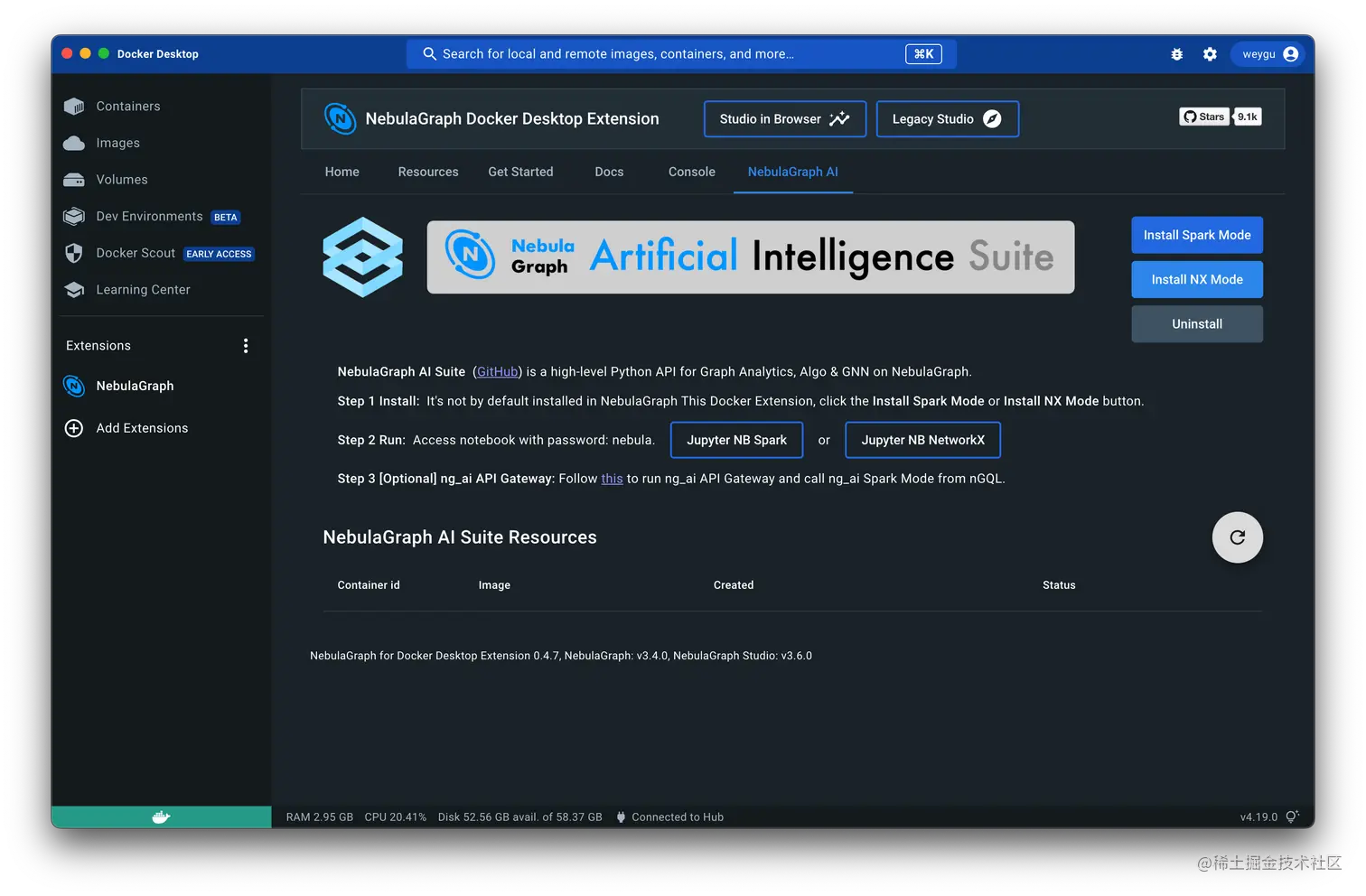 我们已经准备好了一键部署的 NebulaGraph + NebulaGraph Studio + ng_ai in Jupyter 的环境,只需要大家从 Docker Desktop 的 Extension(扩展)中搜索 NebulaGraph,就可以试玩了。