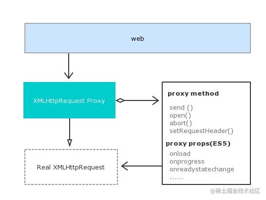 - 最后,用代理 XMLHttpRequest 对象覆盖全局的原始的 XMLHttpRequest 对象。