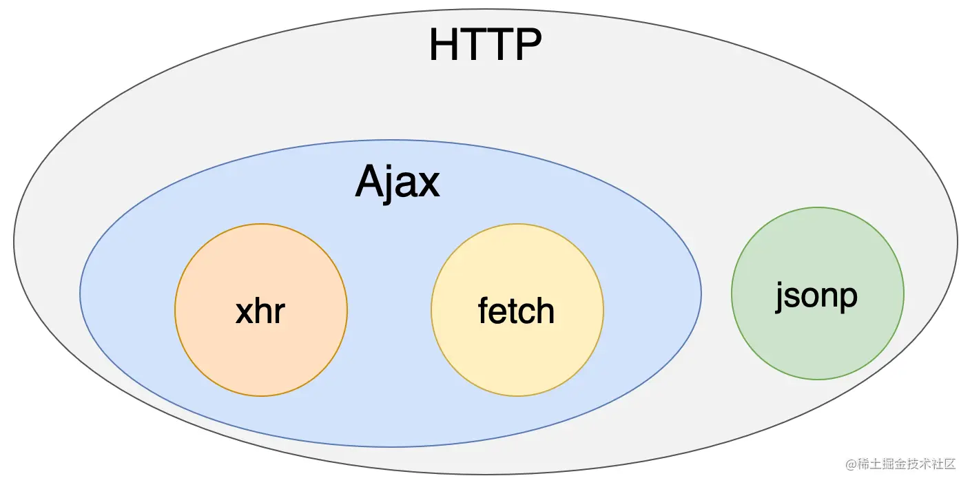 综上所述,我们认为 Ajax 是一种支持网页内容异步更新的 Web 应用架构,Ajax 架构下包括了xhr和 Fetch API 两种 HTTP 请求方法,而jsonp一种跨域数据交互协议,不过也可以用来实现 HTTP 请求。它们之间的关系如下: