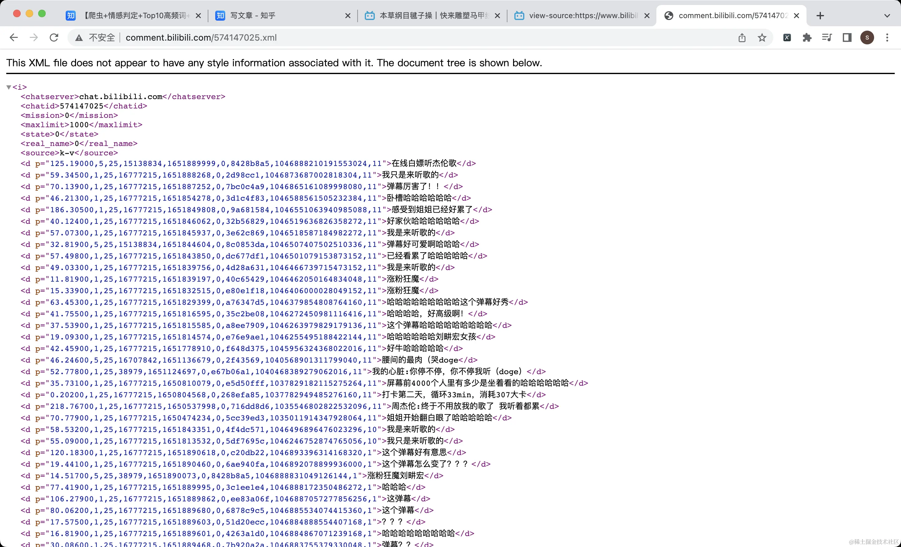 解析xml页面:标签的文本内容为弹幕,标签内p属性值(按逗号分隔)的第四个字段是时间戳: