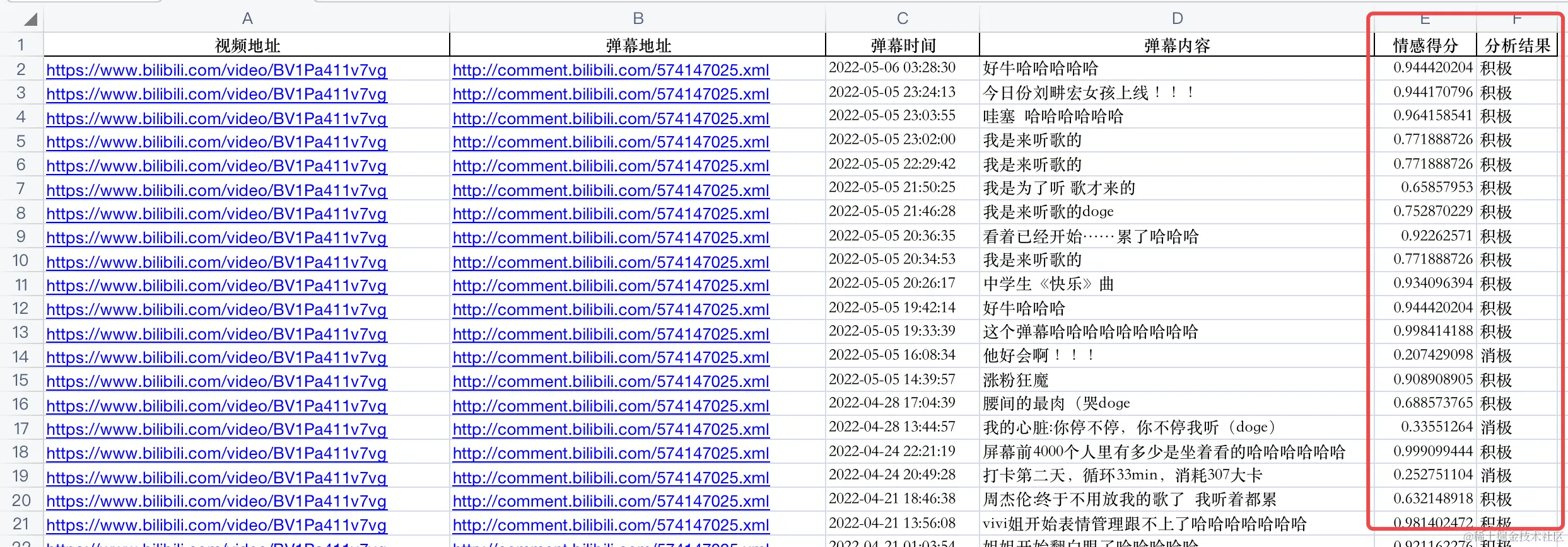 这里,我设定情感得分值小于0.5为消极,大于0.5为积极,等于0.5为中性。(这个分界线,没有统一标准,根据数据分布情况和分析经验自己设定分界线即可)