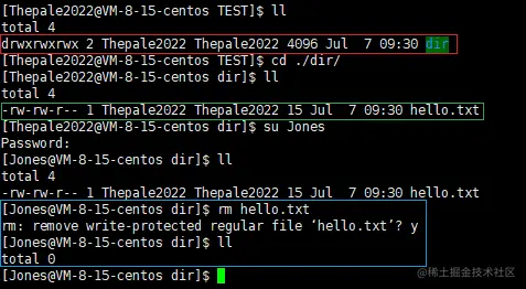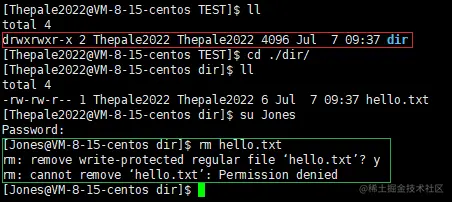 目录的权限是所有人可读可写可执行(红色部分),但目录内文件 hello.txt 对于 others 只有读权限(绿色部分),此时切换用户到 Jones,现在其所对应的身份是 others,对文件进行删除,发现删除成功(蓝色部分)。
