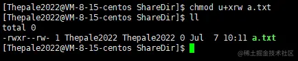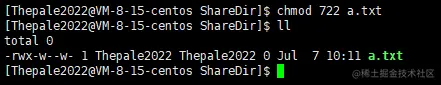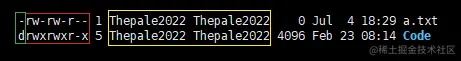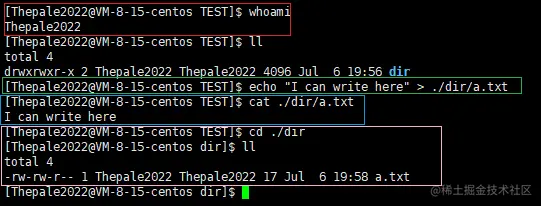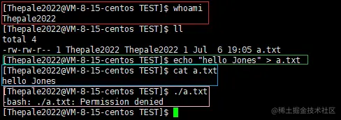 由红色部分可知,现在的用户是 Thepale2022,且 Thepale2022 是文件的拥有者和所属组(这里仅判定为拥有者,详见文章末尾),故具有 r w 权限,没有 x 权限。(绿色部分:具有写权限证明;蓝色部分:具有读权限证明;粉色部分:不具有执行权限证明)