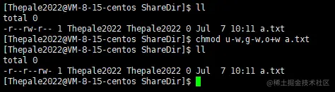 如果去除了 others 的写权限(红色部分),则无法删除(绿色部分)。故得知:一个文件能否被删除由目录权限决定,与文件自身权限无关。故在讲述文件权限时并未列举删除操作。