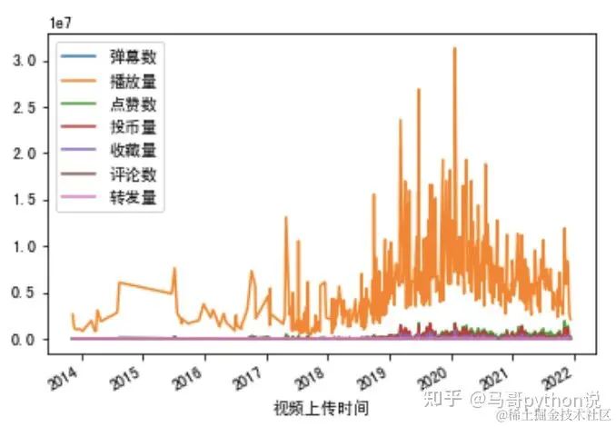 '点赞数', '投币量', '收藏量', '评论数', '转发量', '视频上传时间']] # 去掉不关心的列
