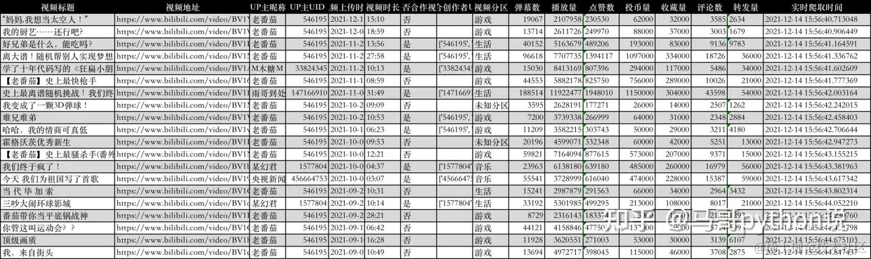 视频标题,视频地址,视频上传时间,视频时长,是否合作视频,视频分区,弹幕数,播放量,点赞数,投币量,收藏量,评论数,转发量,实时爬取时间