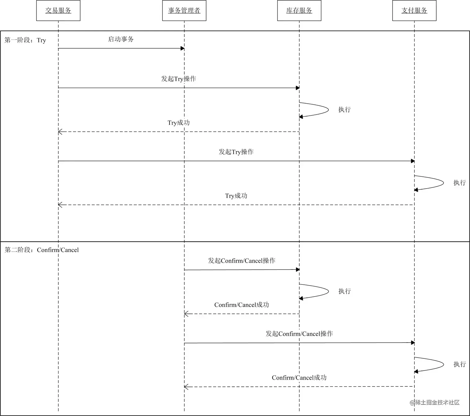 我们再来梳理下,TCC 模式的流程。第一阶段主业务服务调用全部的从业务服务的 Try 操作,并且事务管理器记录操作日志。第二阶段,当全部从业务服务都成功时,再执行 Confirm 操作,否则会执行 Cancel 逆操作进行回滚。