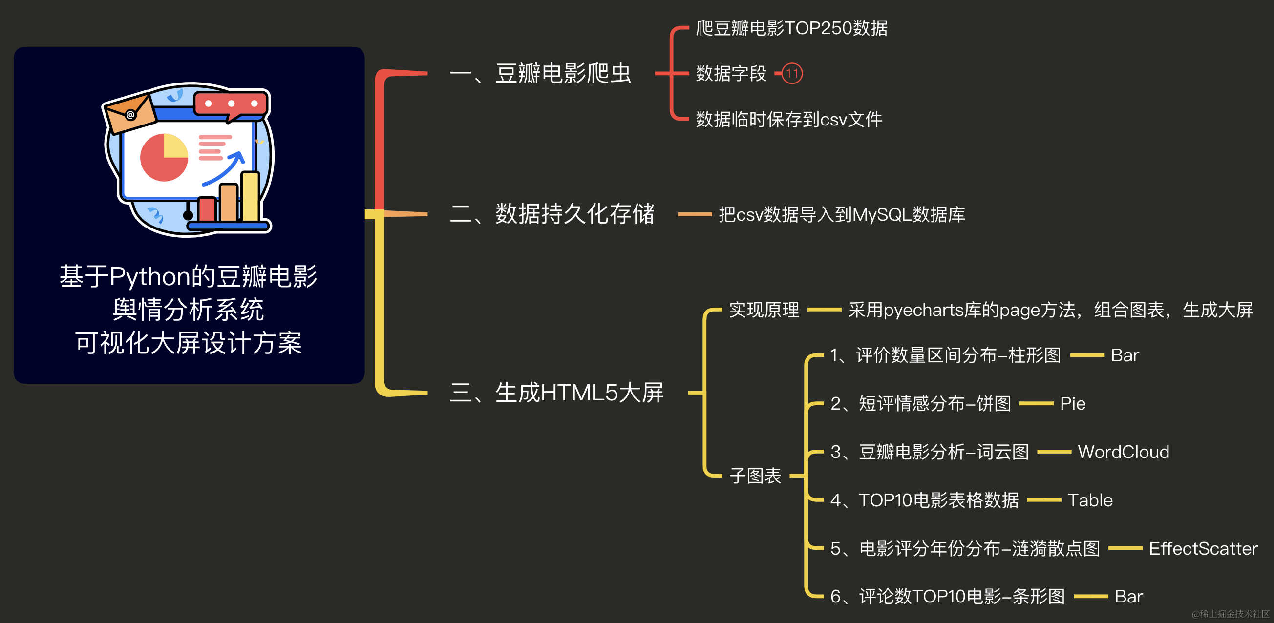 如文章开头的思维导图所说,首先把各个子图表开发出来,然后用pyecharts的Page组件,把这些子图表拼装组合起来,形成大屏。