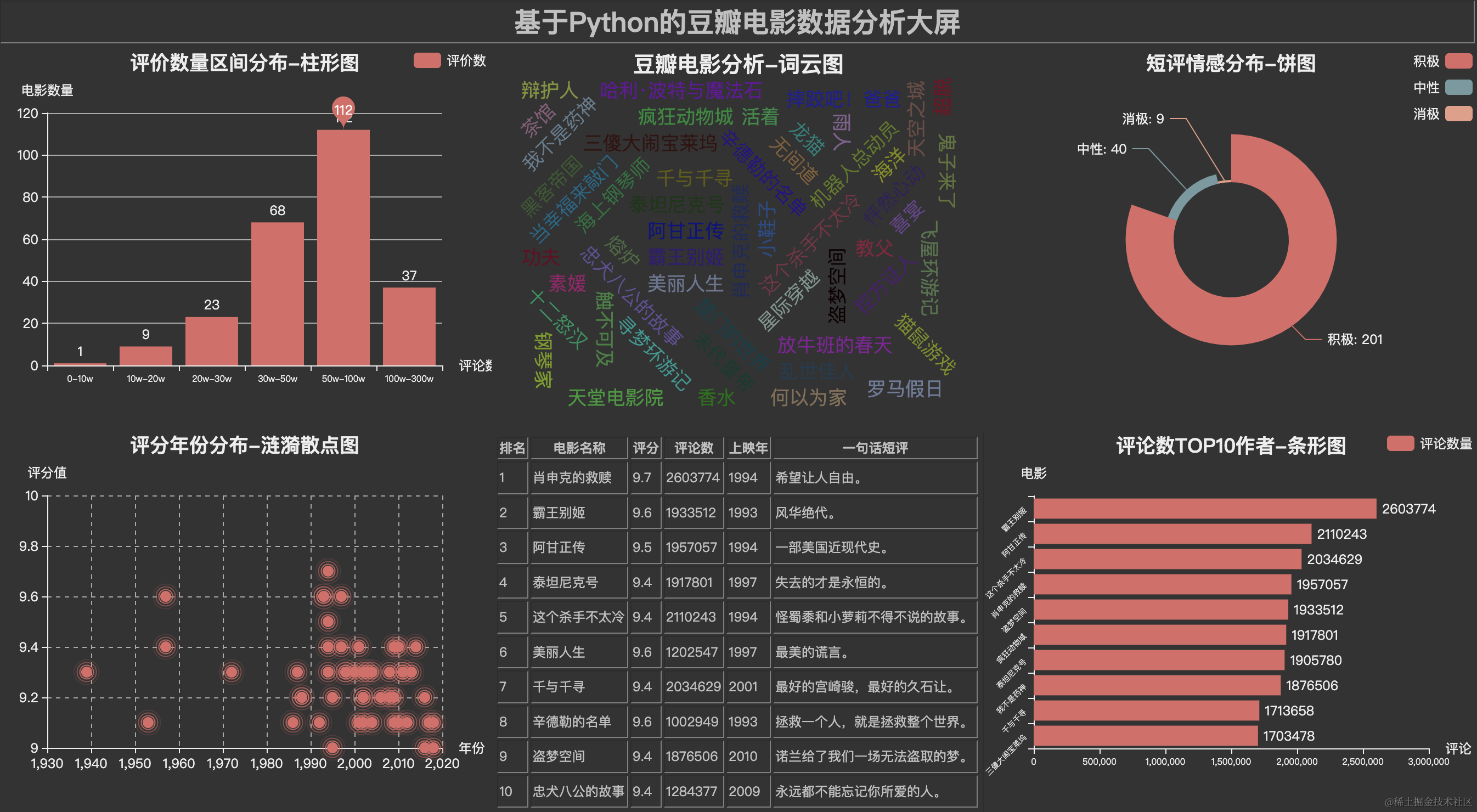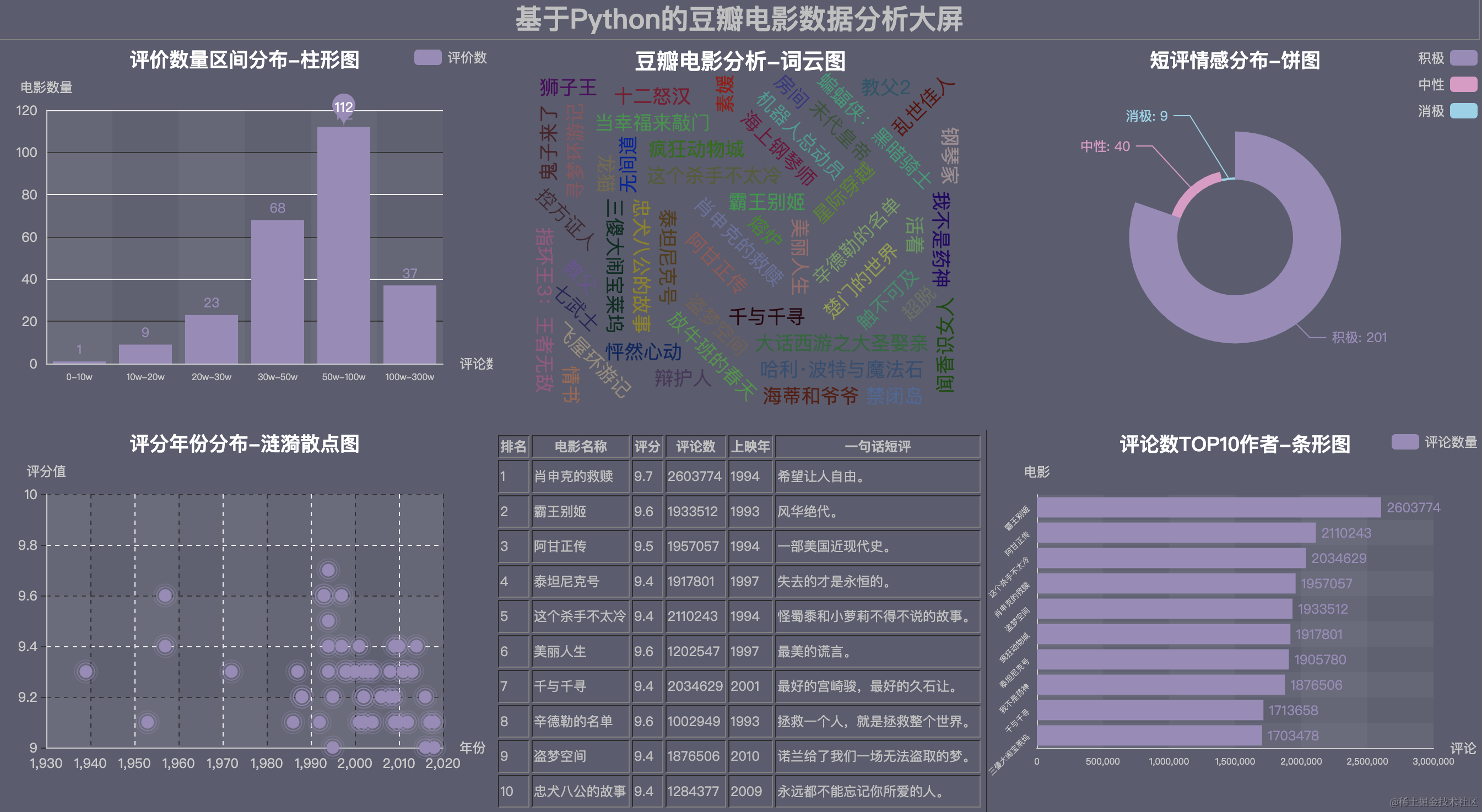 针对TOP250排行榜的数据,开发一套可视化数据大屏系统,展示各维度数据分析结果。
