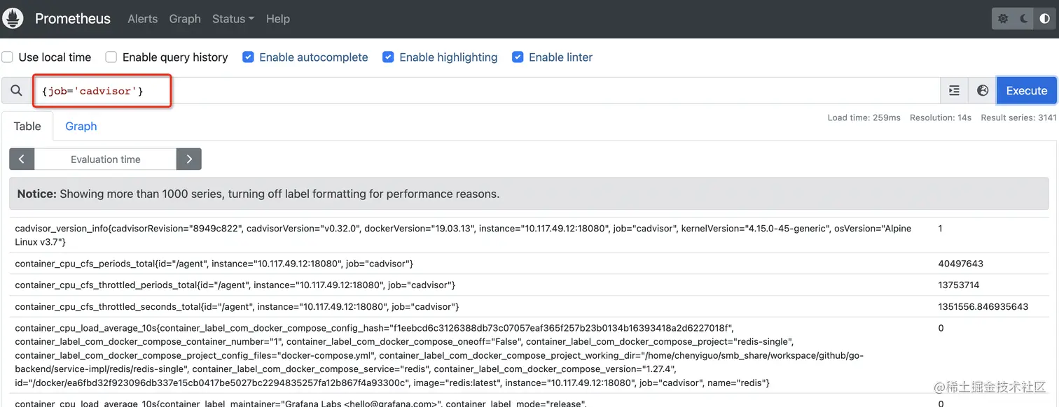 对此,更好的方法是与Prometheus集成,实现Docker容器数据的收集与保存。由于CAdvisor提供了支持Prometheus的metrics格式接口,所以Prometheus只需要按照获取Exporter指标的方式,创建相关的Job即可。