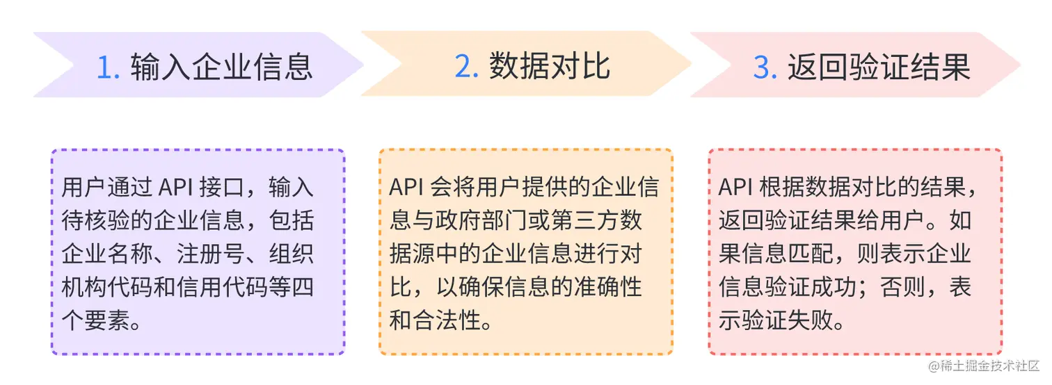 - 发起核验请求:当需要核验企业信息时,在系统中调用企业工商四要素核验 API,将收集到的企业信息作为参数传递给 API。这将触发 API 向核验供应商的服务器发送请求,并等待响应。