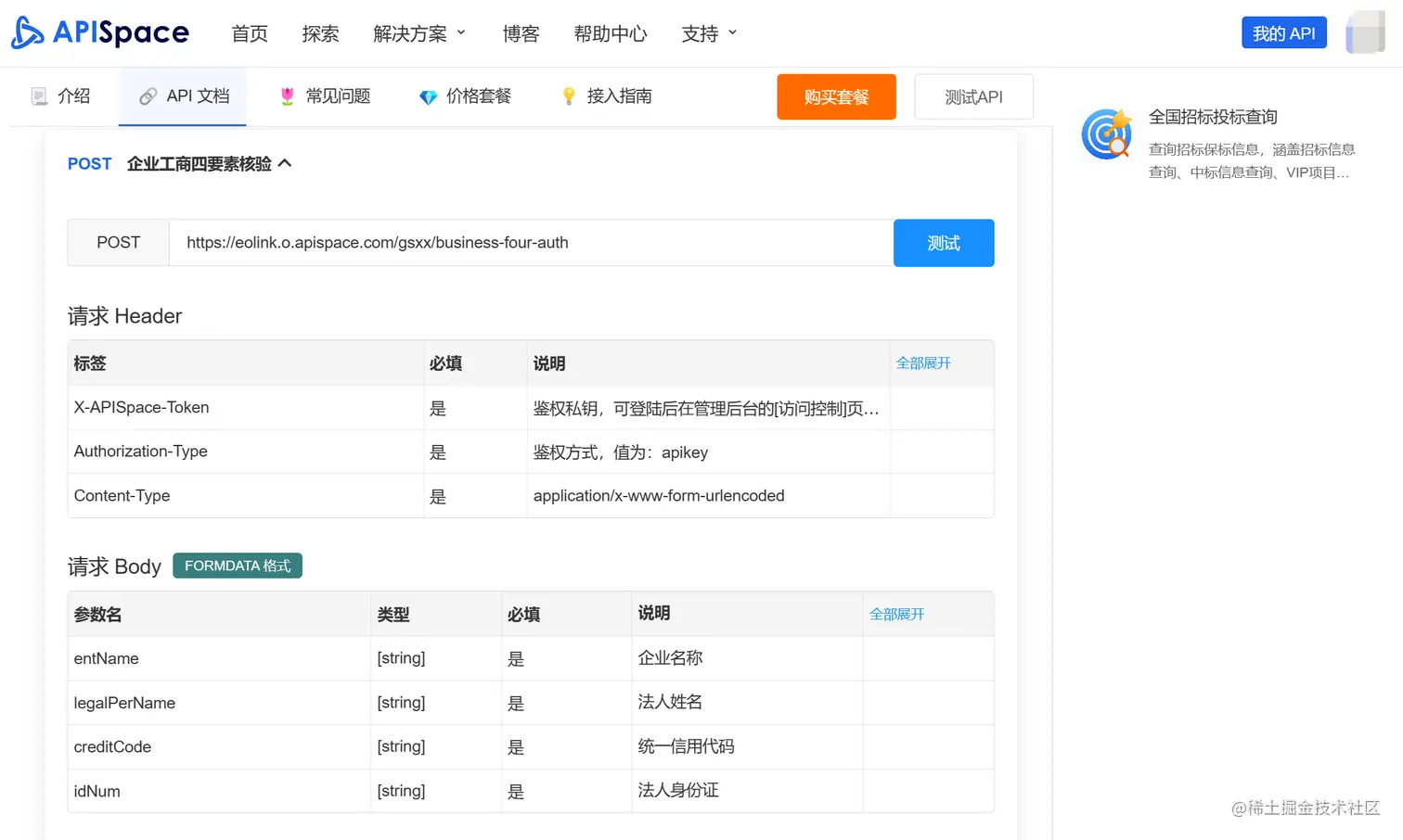 - 选择合适的企业工商四要素核验 API 供应商:首先,金融机构和风控服务需要选择一个可靠的企业工商四要素核验 API 供应商。确保供应商提供准确、及时的核验结果,并具有稳定的服务可用性和数据安全性。我使用的是 APISpace 的 企业工商四要素核验API。