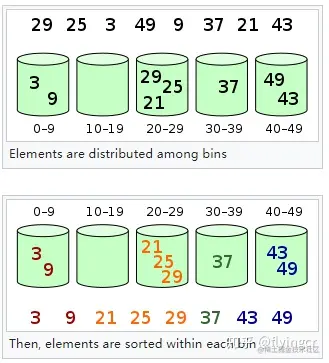 性能提升:可以从第二部分的时间复杂度下手,即减少对每个桶的排序时间,可以减少每个桶里面的数,或者也可以通过增加桶的数量,当然当桶的数量增加时也会影响空间复杂度