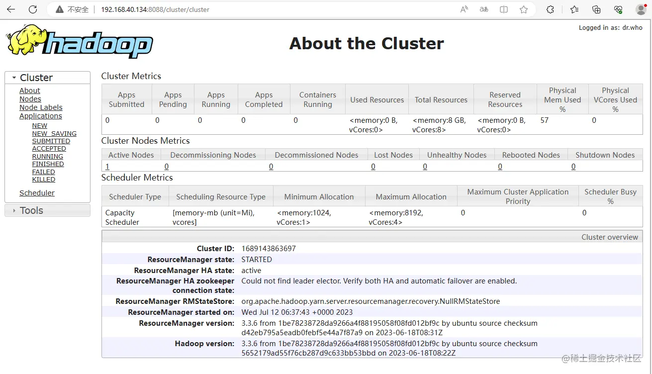 截至到目前配置,可以测试启动Hadoop,此种方式可手动执行MapReduce任务,该部分仅验证是否可正常启动。
