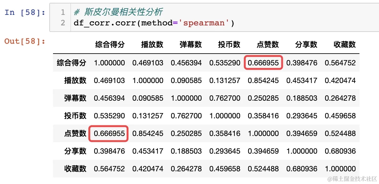 可以看出,点赞数和综合得分的相关性最高,达到了0.66。