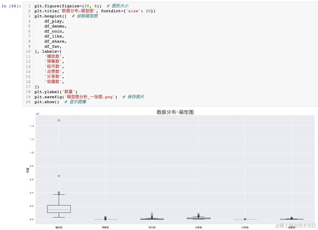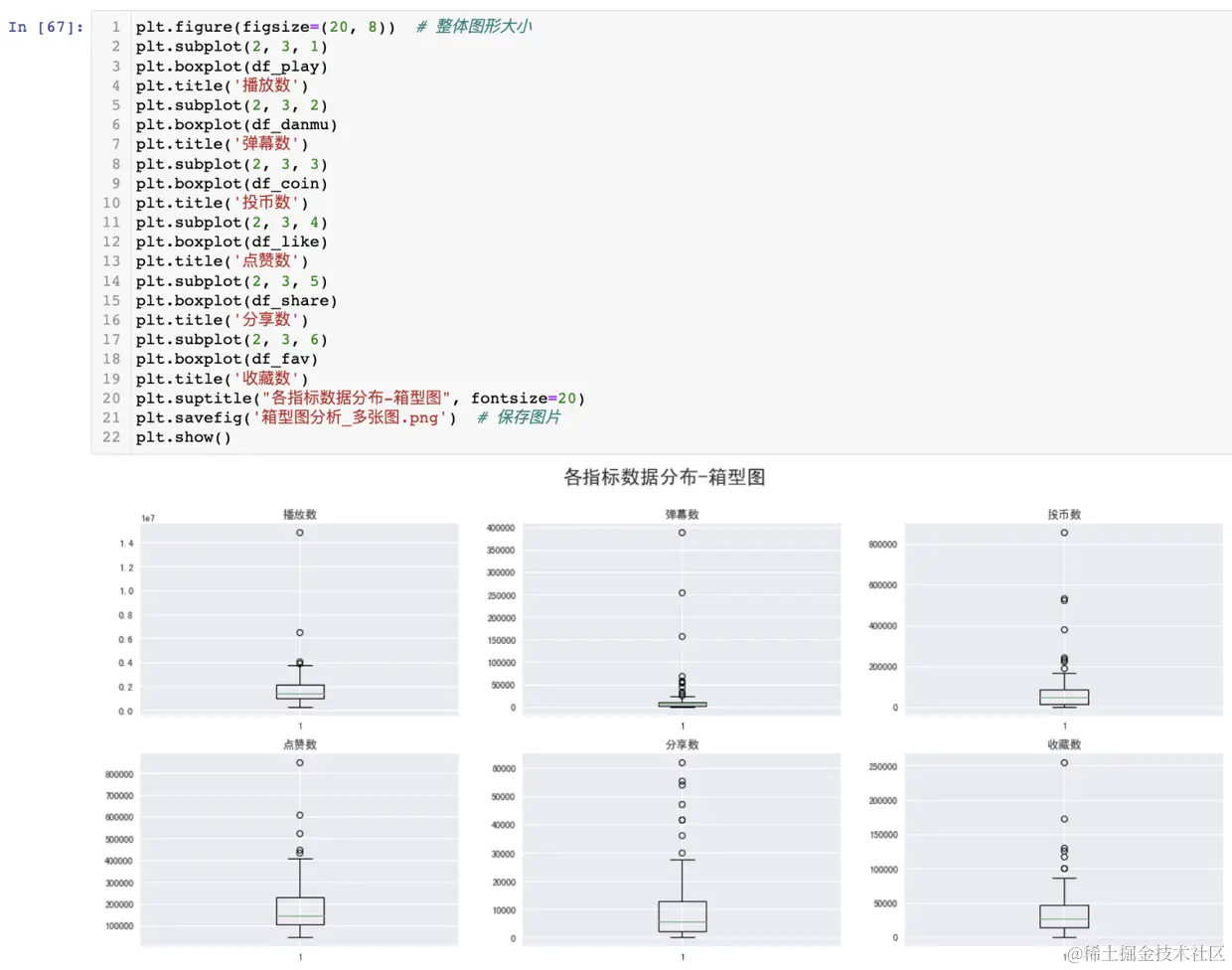 可以发现,由于播放数远远大于其他数据指标,不在一个数量级,导致其他数据指标的box都挤到一块了,可视化效果很差,所以,我打算把每个box画到一个图里,避免这种情况的发生。