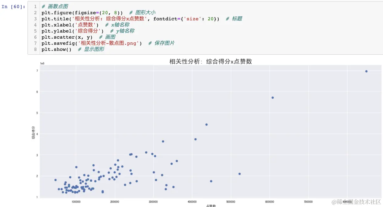 根据此分析结论,进一步画出点赞数和综合得分的分布散点图,验证此结论的正确性。